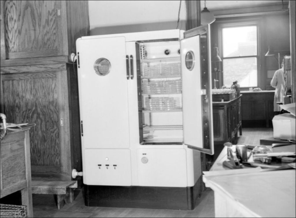 - Vues du laboratoire d'analyse de lait de J. Archambault situé à Montréal. Nous apercevons l'incubateur à lait (E6,S7,SS1,P12372), les tubes de phosphate (E6,S7,SS1,P12373), une chimiste qui procède à des analyses (E6,S7,SS1,P12378) et l'équipement utilisé en laboratoire (E6,S7,SS1,P12374, E6,S7,SS1,P12376 et E6,S7,SS1,P12377). Nous remarquons les diagrammes portant sur la température et son influence sur l'incubation du lait (E6,S7,SS1,P12379 à E6,S7,SS1,P12381) ainsi qu'un formulaire d'analyse d'échantillons de lait (E6,S7,SS1,P12382). Dossier produit pour le ministère de la Santé