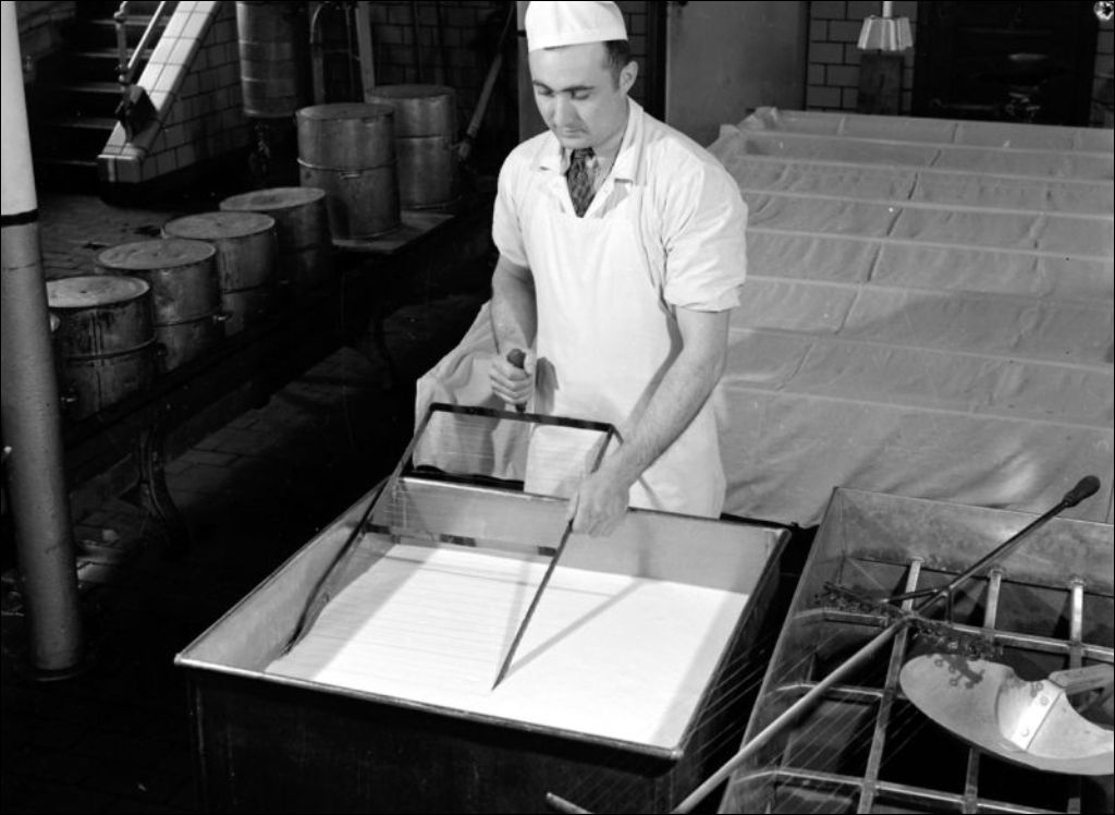 Fabrication de fromage à l'École de laiterie de la province de Québec à Saint-Hyacinthe, 1945, Archives nationales à Montréal, Fonds Ministère de la Culture et des Communications, (06M,E6,S7,SS1,D18387-18396), Claude Décarie.