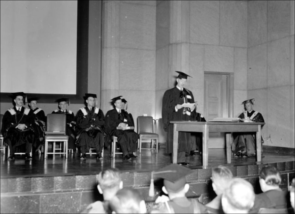 Remise de doctorats honoris causa à l'Université de Montréal. Édouard Monpetit, professeur de la Faculté de droit de l'Universté de Montréal, le maire de Montréal, Camilien Houde et Esdras Minville sont présents pour l'occasion