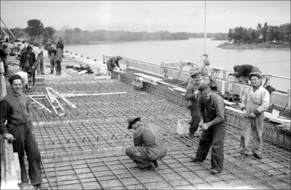 Construction du pont de Sainte-Rose, également connu sous le nom de pont Marius-Dufresne, à l'île Jésus, aujourd'hui devenue Ville de Laval