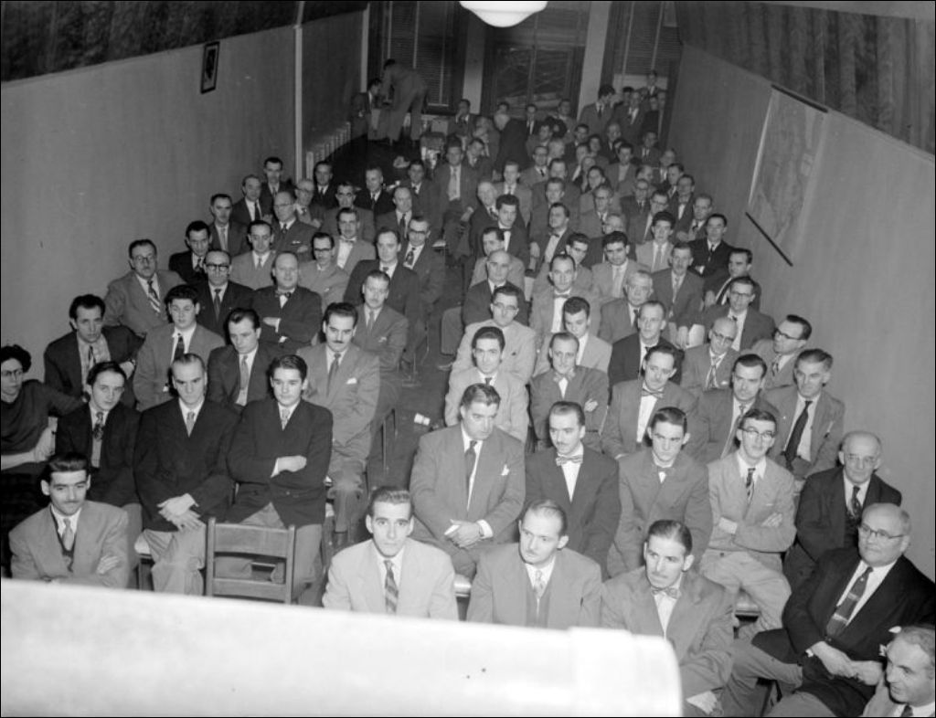 B. Laberge. Soirée de réunion de producteurs de cuir, 1953, Archives nationales à Montréal, Fonds Ministère de la Culture et des Communications, (06M,E6,S7,SS1,D200848-200848), Photographe non identifié.