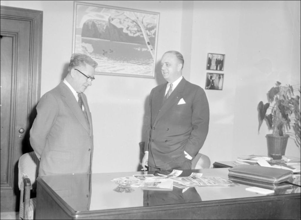 - Visite de monsieur Boivin, maire de Granby, à l'Hôtel Queen's situé sur la rue Windsor (devenue la rue Peel) à Montréal. Nous l'apercevons en réunion