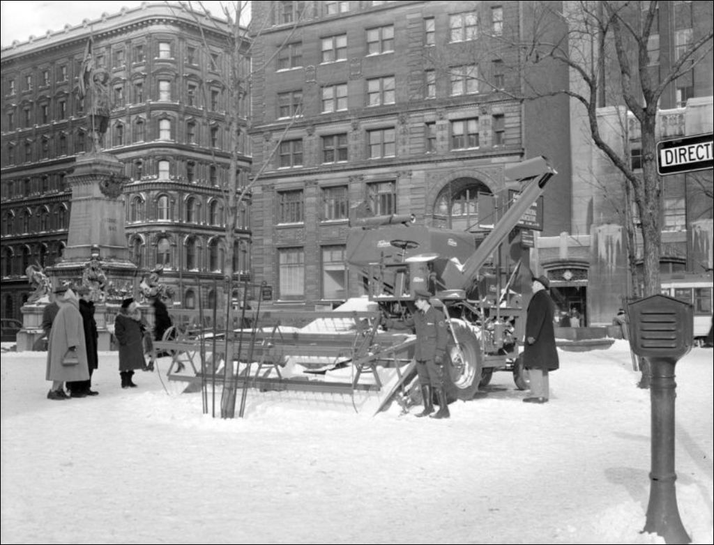 - Vues de la machinerie agricole exposée à la Place d'Armes à Montréal. Nous apercevons le monument érigé en l'honneur de Paul de Chomedey de Maisonneuve (E6,S7,SS1,P201061) et l'église Notre-Dame (E6,S7,SS1,P201062)