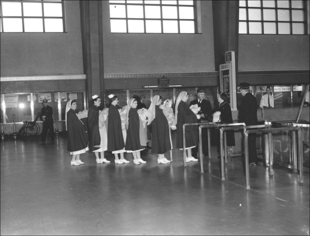 - Infirmières de l'Hôpital Général de la Miséricorde situé sur la rue Saint-Denis à Montréal. Nous apercevons les infirmières qui tiennent des enfants dans leurs bras en compagnie d'une religieuse de des Soeurs de Miséricorde de Montréal (E6,S7,SS1,P201254). Nous les retrouvons possiblement à la gare (E6,S7,SS1,P201253)