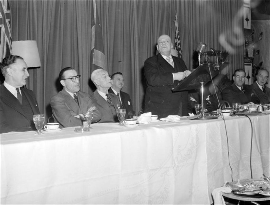- Il s'agit d'une réunion. Nous apercevons la table d'honneur (E6,S7,SS1,P201393 et E6,S7,SS1,P201397) et Camillien Houde, maire de Montréal, qui prononce un discours (E6,S7,SS1,P3201392). Nous remarquons des invités qui sont réunis (E6,S7,SS1,P201395)