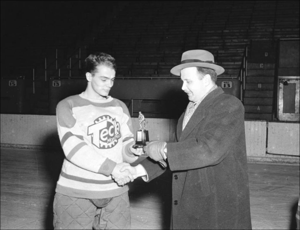 - Il s'agit d'une remise de trophée. Le prix est décerné à une équipe de joueurs de hockey. Nous remarquons l'équipe de l'École technique de Montréal située sur la rue Sherbrooke Ouest à Montréal (E6,S7,SS1,P201617 et E6,S7,SS1,P201621). Dossier produit pour M. Malfara