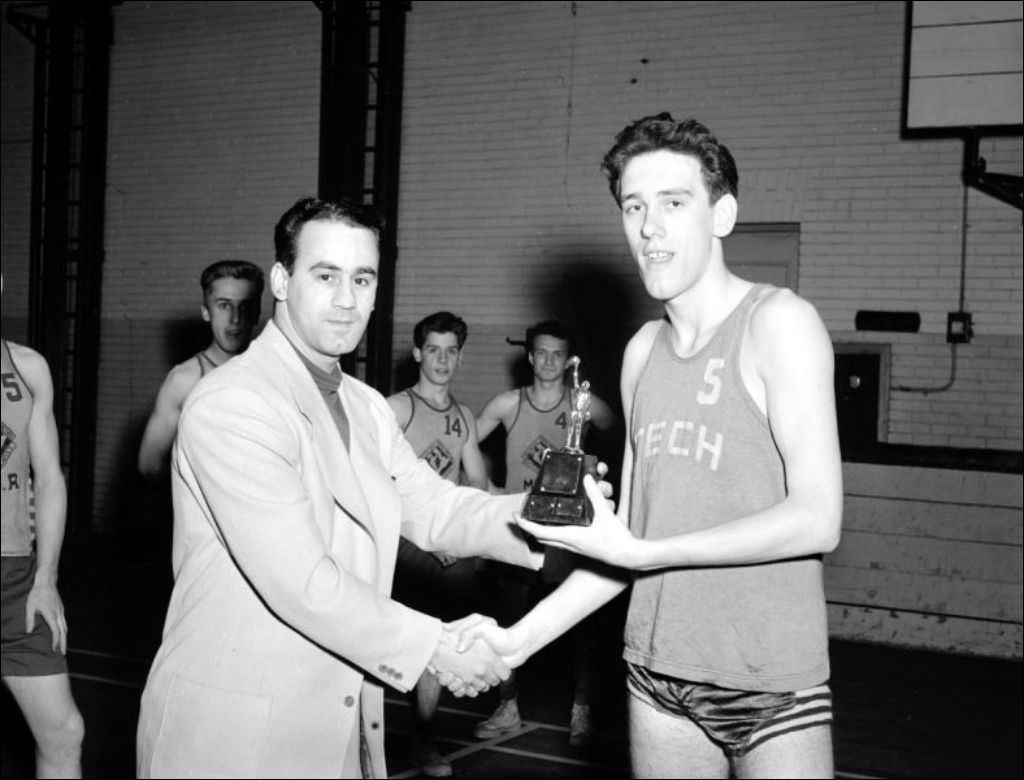- Il s'agit d'une remise de trophée décerné lors d'un match de basket-ball disputé entre l'École technique et l'École d'arts et métiers