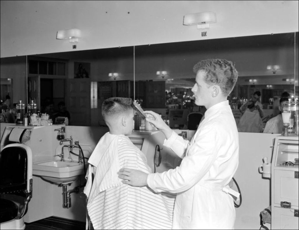 M. Poirier, barbier, [1954?], Archives nationales à Montréal, Fonds Ministère de la Culture et des Communications, (06M,E6,S7,SS1,D201836-201836), Photographe non identifié.