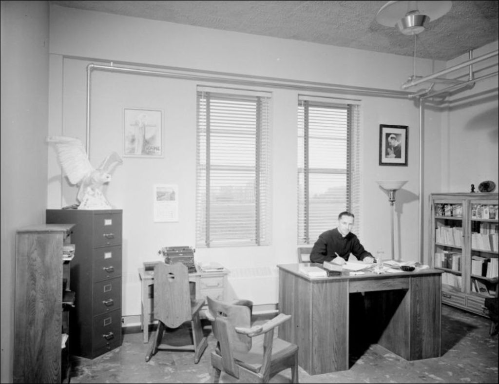 - Vues de l'École d'agriculture de Mont-Laurier. L'Abbé Fernand Parent, directeur de l'École, travaille à son bureau (E6,S7,SS1,P202261). Nous apercevons le fumoir des professeurs (E6,S7,SS1,P202262), la salle de récréation et académique (E6,S7,SS1,P202264), la classe de première année (E6,S7,SS1,P202265) et la salle de couture ou de couture des filles (E6,S7,SS1,P202266). Nous retrouvons également la chapelle (E6,S7,SS1,P202267), le réfectoire des élèves (E6,S7,SS1,P202268). Nous remarquons les bâtiments de la ferme (E6,S7,SS1,P202270) et de l'École (E6,S7,SS1,P202272, E6,S7,SS1,P202274 et E6,S7,Ss1,P202275). Les membres de l'exécutif de la Corporation de l'École d'agriculture sont réunis : Jean Lafleur, trésorier, l'abbé Ernest Léonard, directeur, Mgr Maurice Leclerc, président, l'abbé Fernand Parent, secrétaire et directeur de l'École et Victor Racine, B.S.A. vice-président (E6,S7,SS1,P202276)