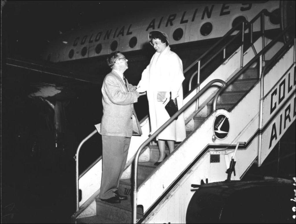 - Arrivée de Mademoiselle Man à l'Aéroport de Dorval. Nous l'apercevons à la sortie de l'avion de la compagnie «Colonial Airlines»