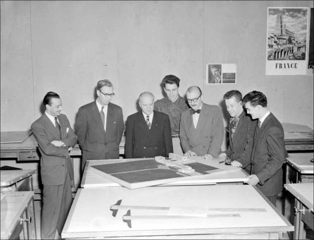 - Visite des étudiants de l'École des Beaux-Arts de Québec à l'École des Beaux-Arts de Montréal située sur la rue Saint-Urbain à Montréal. Nous apercevons les invités qui regardent une maquette (E6,S7,SS1,P203920). À cette occasion, un banquet est servi (E6,S7,SS1,P203921 et E6,S7,SS1,P203922). Les étudiants et professeurs sont réunis (E6,S7,SS1,P203923 et E6,S7,SS1,P203924)