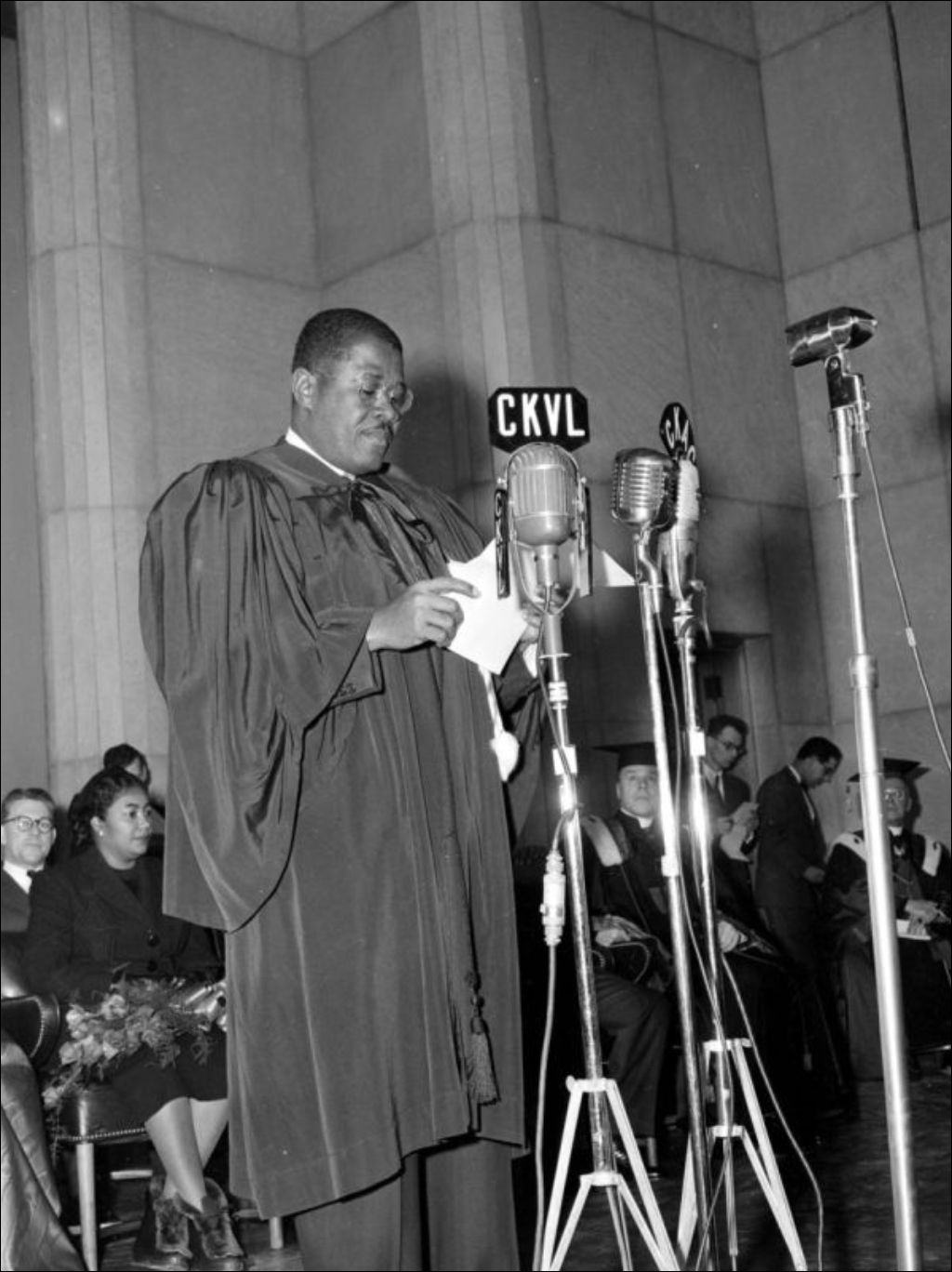 - Remise d'un doctorat honorifique au président d'Haïti Paul Eugène Magloire à l'Université de Montréal. Les invités souhaitent la bienvenue au président (E6,S7,SS1,P204640). Mgr Olivier Maurault, recteur de l'Université de Montréal, fait des éloges au président Magloire (E6,S7,SS1,P205637). Paul-Eugène Magloire prononce un discours à l'occasion de la réception du doctorat honorifique (E6,S7,SS1,P204633), remercie J.-Charles Magnan pour l'organisation de l'événement et discute avec le cardinal Paul-Émile Léger (E6,S7,SS1,P204634). Nous remarquons le cardinal qui signe le livre d'or (E6,S7,SS1,P204636). L'épouse du président Magloire reçoit des fleurs à cette occasion (E6,S7,SS1,P204635 et E6,S7,SS1,P204639). Dossier produit pour C. Magnan, ministère de l'Agriculture