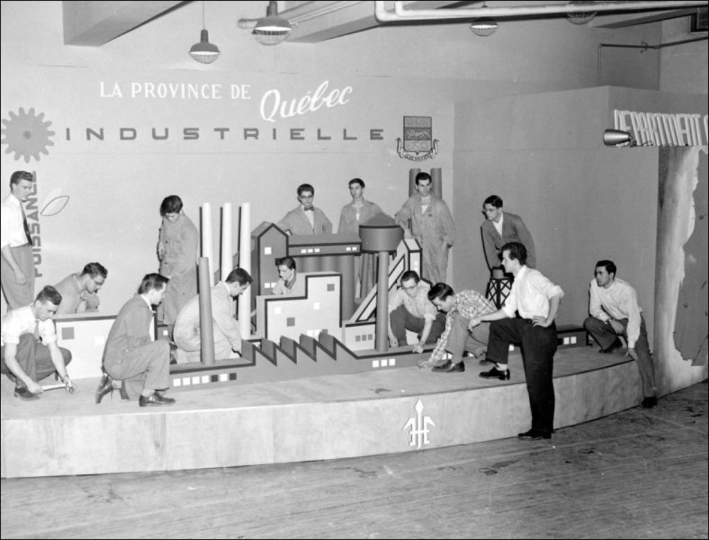 - Visite d'une exposition par les étudiants de l'École Technique située sur la rue Sherbrooke Ouest à Montréal. Nous apercevons les kiosques de la province de Québec industrielle (E6,S7,SS1,P204892) et du ministère de l'Industrie et du Commerce (E6,S7,SS1,P204894 et E6,S7,SS1,P204895). Reportage produit pour Rosario Bélisle, École Technique