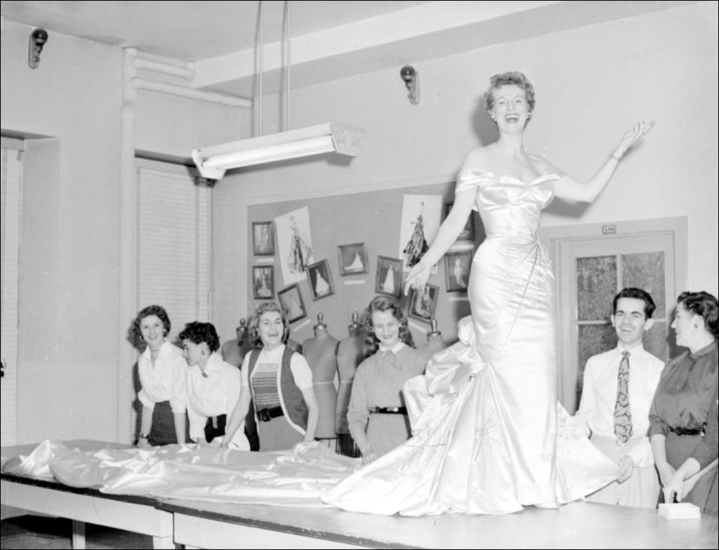 Cliché de Denise Pelletier élue Reine de la radio et de la télévision 1955. Comme le veut la tradition, Denise Pelletier porte une création d'un étudiant de l'École centrale d'arts et métiers située sur la rue Saint-Denis à Montréal. Dossier créé pour le ministère du Bien-être social et de la Jeunesse