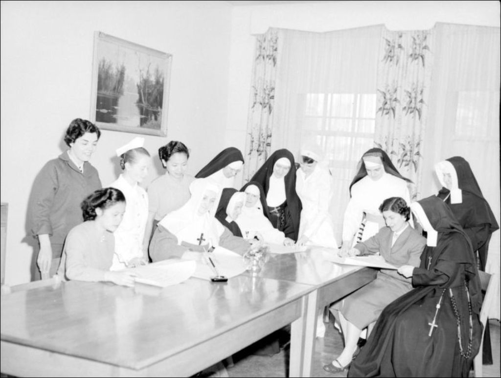 - À l'occasion d'une exposition qui se déroule à l'Hôpital Sainte-Justine, les religieuses de la congrégation des Soeurs grises travaillent à l'Université de Montréal. Nous assistons à un cours sur l'appareil circulatoire (E6,S7,SS1,P205582). Les religieuses sont en compagnie des étudiantes à la bibliothèque (E6,S7,SS1,P205580 et E6,S7,SS1,P205585) et au laboratoire (E6,S7,SS1,P205583 et E6,S7,SS1,P205591). Des patients reçoivent des soins (E6,S7,SS1,P205584, E6,S7,SS1,P205587, E6,S7,SS1,P205588 et E6,S7,SS1,P205590). Dossier produit pour M. Deléan, ministère de la Santé