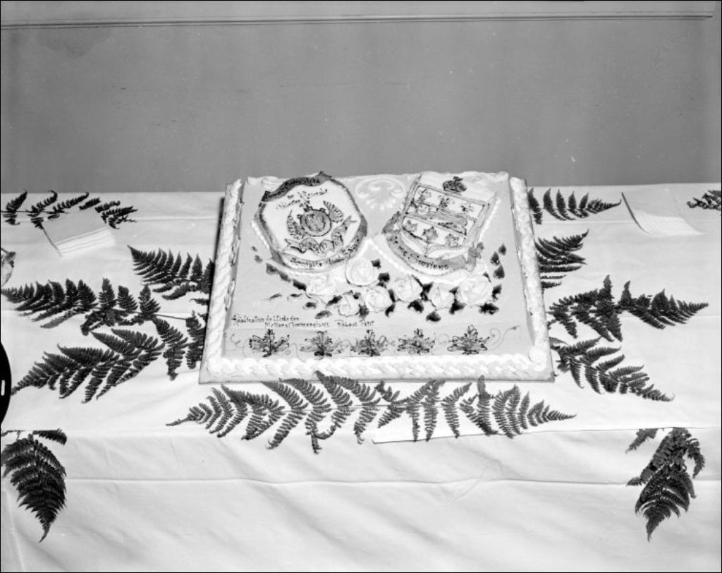 - Remise de trophées par J.-Paul Sauvé, ministre du Bien-être social et de la Jeunesse, aux joueurs de ballon-panier de l'École des Arts graphiques située sur la rue Kimberley à Montréal qui s'est déroulée à La Palestre Nationale située sur la rue Cherrier à Montréal. Nous apercevons un gâteau confectionné pour l'occasion (E6,S7,SS1,P205789). Les invités d'honneur sont réunis pour l'événement (E6,S7,SS1,P205794). Dossier créé pour R. Prévost, ministère du Bien-être social et de la Jeunesse