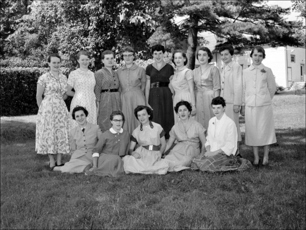 Mlle Morier, directrice. Groupe d'étudiantes à l'extérieur de la bâtisse de l'École - Upton, 1955, Archives nationales à Montréal, Fonds Ministère de la Culture et des Communications, (06M,E6,S7,SS1,D205980-205982), Claude Décarie.