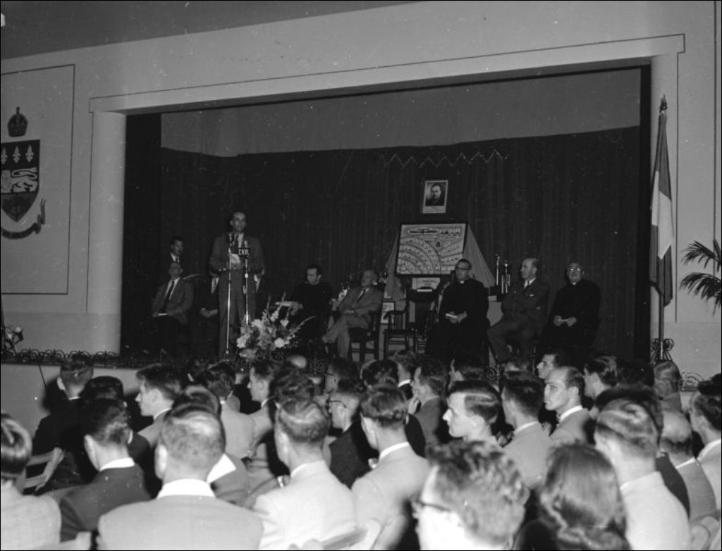 - Remise de diplômes aux étudiants du Mont-Saint-Antoine, dirigé par les Frères de la Charité, situé sur la rue Sherbrooke Est à Montréal. Nous assistons à l'arrivée des invités (E6,S7,SS1,P206234). Sur la scène, nous apercevons les invités d'honneur qui président la cérémonie (E6,S7,SS1,P206233 et E6,S7,SS1,P206239). À cette occasion, une exposition portant sur différents produits confectionnés par les apprentis (E6,S7,SS1,P206235, E6,S7,SS1,P206237, E6,S7,SS1,P206238 et E6,S7,SS1,P206240) tels que des souliers (E6,S7,SS1,P206241) est présentée. Reportage produit pour R. Prévost, directeur