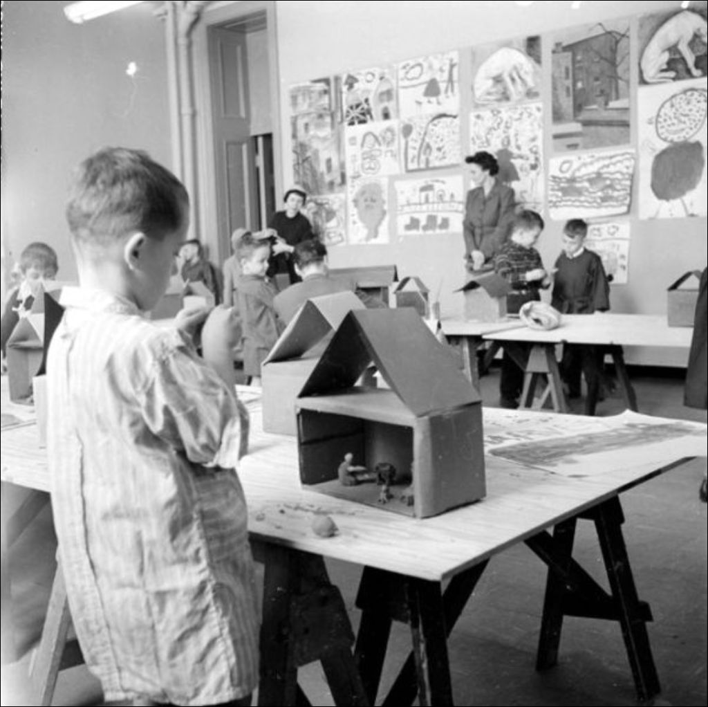 - Il s'agit d'enfants qui font des moulages en terre glaise probablement à l'École des Beaux-Arts située sur la rue Saint-Urbain à Montréal. Reportage commandé par Mademoiselle Sénécal