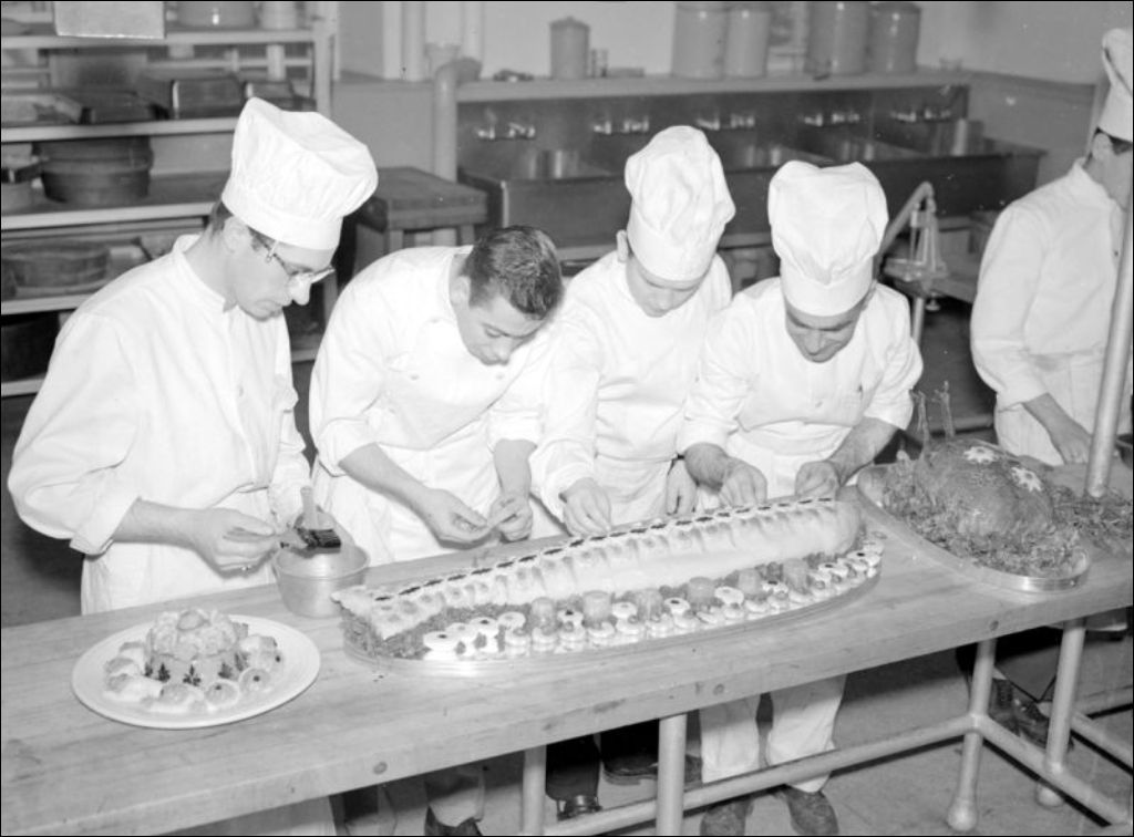 - Exposition d'art culinaire qui s'est probablement déroulée au Palais du Commerce situé sur la rue Berri à Montréal. Les cuisiniers sont au travail (E6,S7,SS1,P207918). Une conférence est offerte aux restaurateurs (E6,S7,SS1,P207924 à E6,S7,SS1,P207926). Nous apercevons les organisateurs réunis (E6,S7,SS1,P207927). Les invités discutent entre eux (E6,S7,SS1,P207920, E6,S7,SS1,P207922 et E6,S7,SS1,P207923). Reportage créé pour M. Puvilland, ministère du Commerce et de l'Industrie