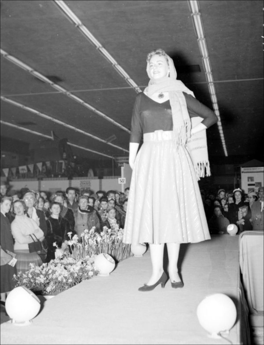 - Défilé de mannequins féminins à l'occasion de l'exposition de l'agriculture qui s'est déroulée au Palais du Commerce situé sur la rue Berri à Montréal. Dossier produit pour J. M. Gauvreau, ministère du Bien-être social et de la Jeunesse
