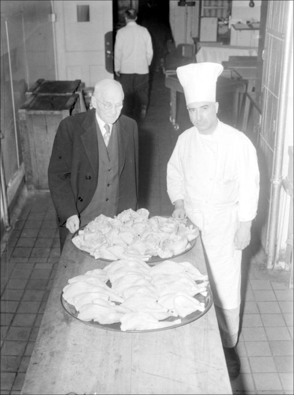 M. Coderre. Association avicole. Chef cuisinier. Hôtel Queen's, rue Windsor à Montréal, 1956, Archives nationales à Montréal, Fonds Ministère de la Culture et des Communications, (06M,E6,S7,SS1,D209044-209046), Photographe non identifié.