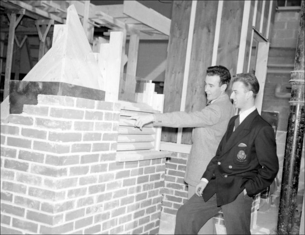 - Étudiants de l'Université de Laval qui visitent les ateliers et les élèves du Centre d'apprentissage des métiers de la construction située sur la rue Parthenais à Montréal. Nous apercevons le groupe réuni (E6,S7,SS1,P209749)