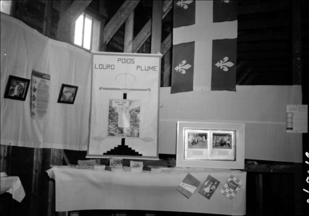 - Un kiosque expose des affiches traitant de l'alimentation et du maintien d'un poids santé. Des visiteurs, des enfants, des hommes du clergé et des organisateurs sont photographiés devant ce kiosque. Dossier commandé par l'infirmière Paquette