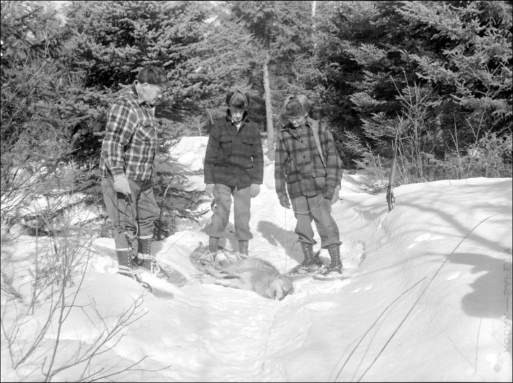 - Représentation de loups et de chevreuils dans un boisé. Nous apercevons également des gardes-chasse qui effectuent une vérification en se déplaçant en forêt à l'aide de raquettes. Des hommes s'affairent également à ramasser des branchages sur un terrain où l'on remarque des chevaux et une grange. Enfin, des clichés d'un avion sur une piste d'atterrissage complètent le dossier. Photographies réalisées pour monsieur F. Bourque