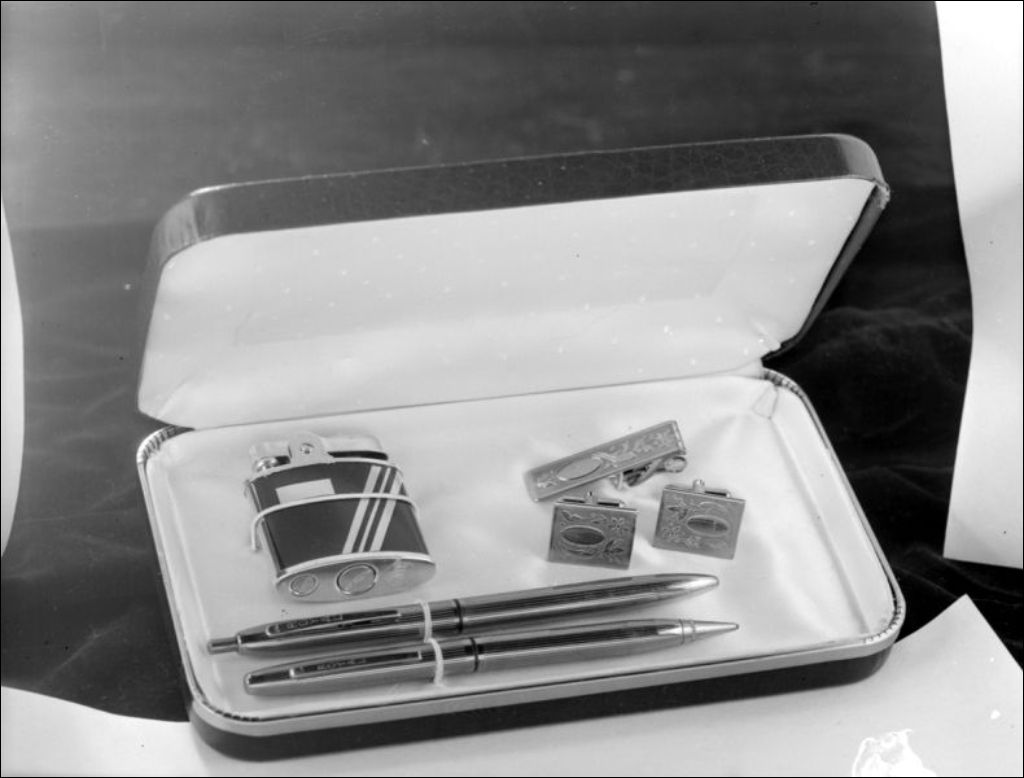 - Représentation de boîtes contenant des stylos-billes, des boutons de manchettes, un collier, un briquet et des montres. Dossier exécuté pour M. Locas