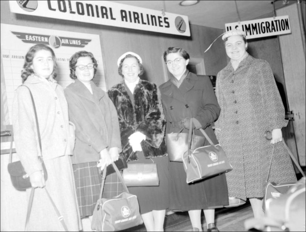 - Les étudiantes sont photographiées avec leurs accompagnatrices devant le guichet de Colonial Airlines ainsi que devant l'avion. À ces images s'ajoute celle d'une dame portant un enfant dans ses bras. Dossier commandé par Dr. J. St-Georges