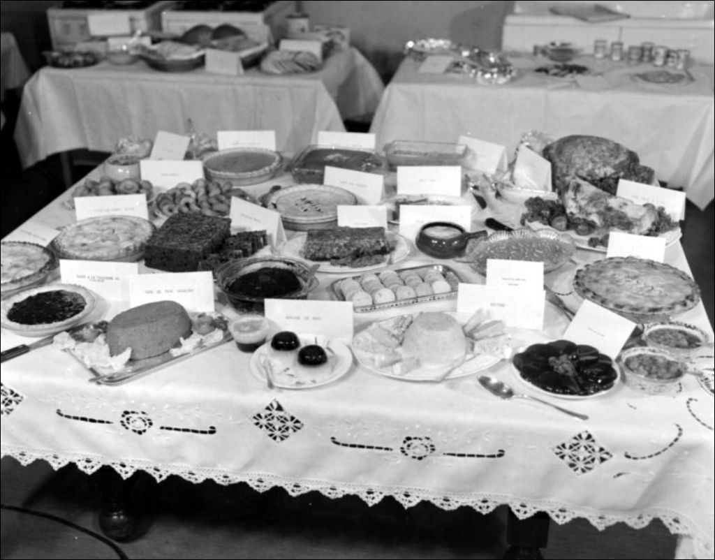 Représentation de plats tels que de la compote de pommes, du pâté de foie canadien, de la ferlouche et des cretons. À ces images s'ajoutent celles de divers produits de l'érable et une grande variété de fromages. Par ailleurs, des femmes sont photographiées devant une table bien garnie et nous croyons y distinguer madame Leblanc, la présidente de l'école