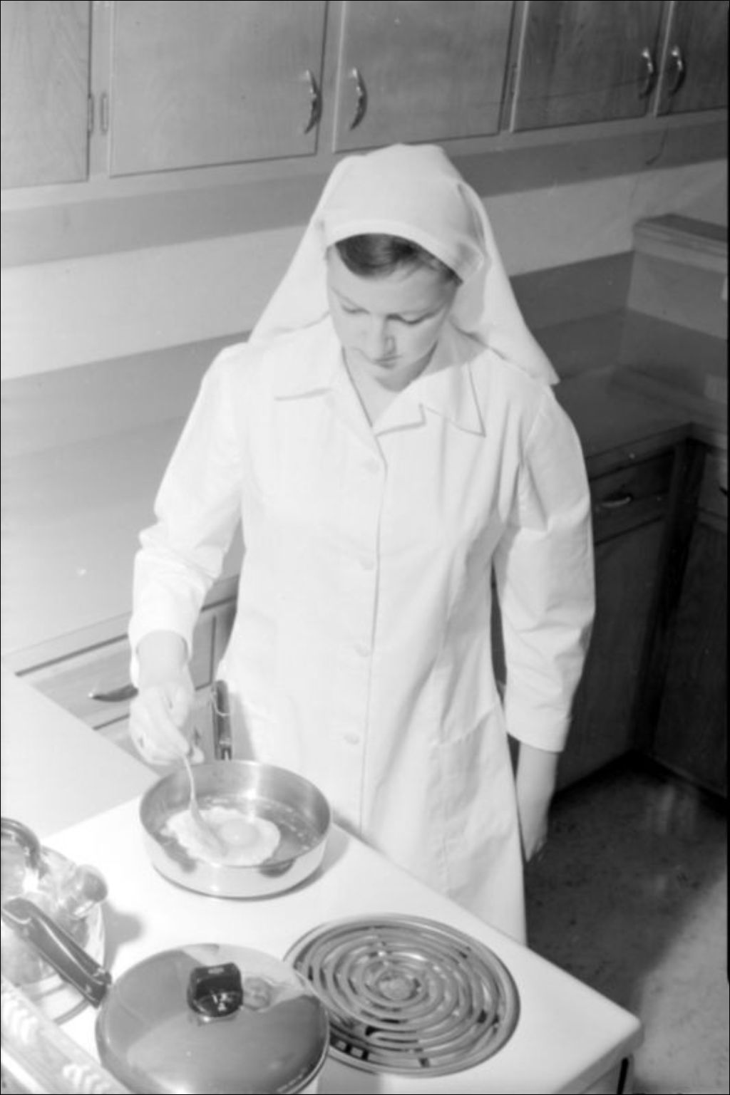 - L'Institut Reine-Marie, situé au 9300 boulevard Saint-Michel, est fondé par les Soeurs de la Présentation de Marie. Sur les clichés, des jeunes filles préparent des plats qui seront servis au personnel de l'Institut. Dossier réalisé pour M. Noel