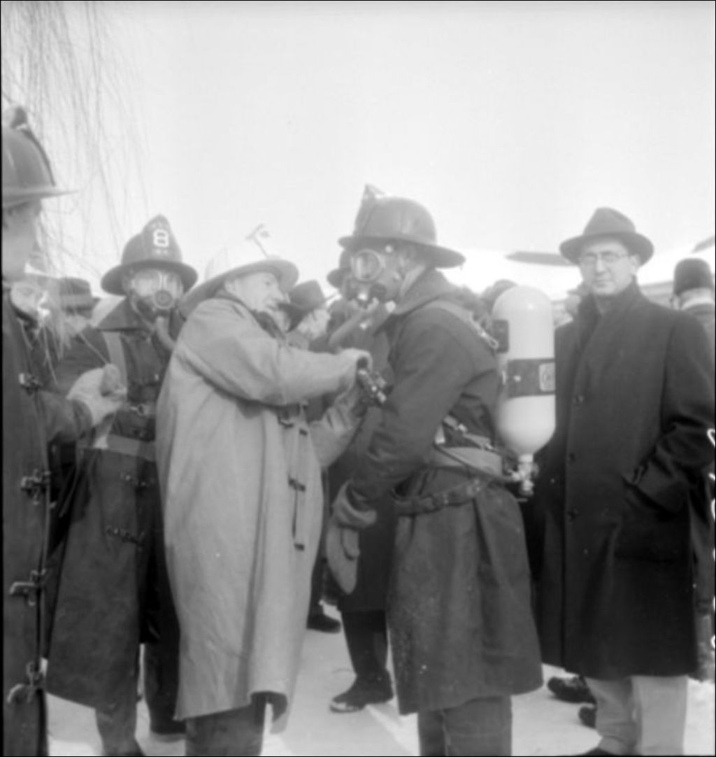 Des pompiers revêtent un masque auquel sont reliés un tube d'alimentation en air et une bouteille d'air comprimé. Dossier réalisé pour monsieur J. Morin