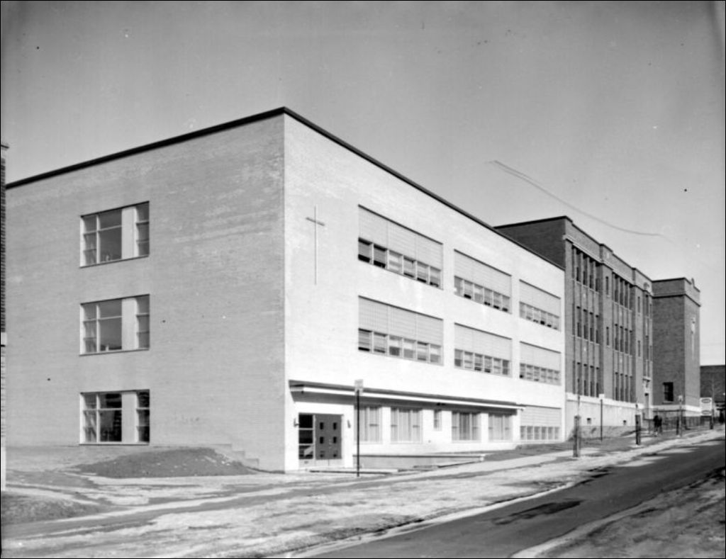Extérieur d'une école publique, [195-?], Archives nationales à Montréal, Fonds Ministère de la Culture et des Communications, (06M,E6,S7,SS1,D213136-213136), Photographe non identifié.