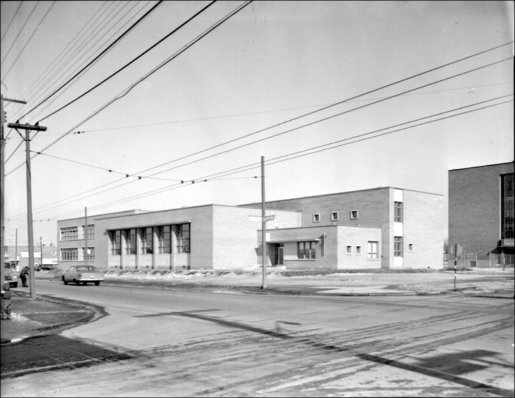 Extérieur de l'école Saint-Marc, située à l'angle de la 6e avenue et de la rue Beaubien Est, à Montréal, [195-?], Archives nationales à Montréal, Fonds Ministère de la Culture et des Communications, (06M,E6,S7,SS1,D213137-213137), Photographe non identifié.