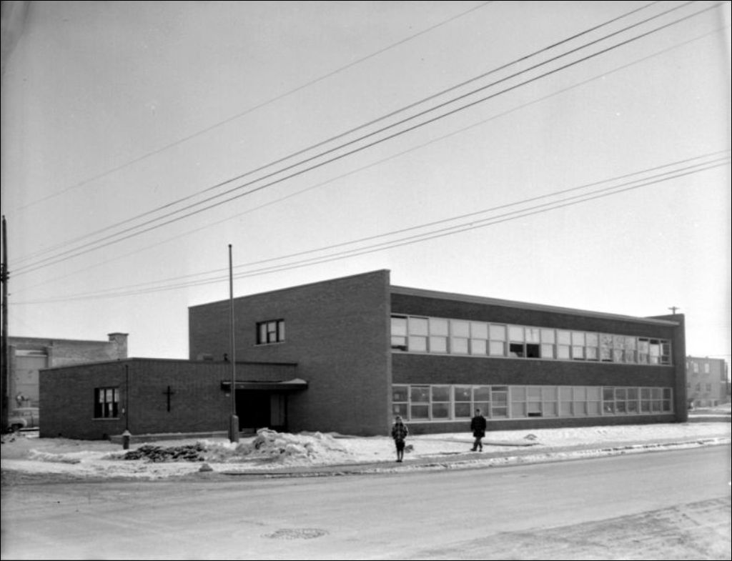 Extérieur d'une école publique, [195-?], Archives nationales à Montréal, Fonds Ministère de la Culture et des Communications, (06M,E6,S7,SS1,D213139-213139), Photographe non identifié.
