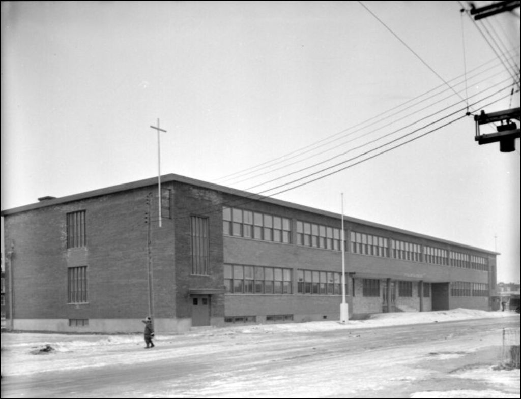 Extérieur d'une école publique, [195-?], Archives nationales à Montréal, Fonds Ministère de la Culture et des Communications, (06M,E6,S7,SS1,D213143-213143), Photographe non identifié.