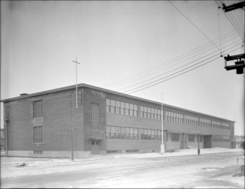 Extérieur d'une école publique, [195-?], Archives nationales à Montréal, Fonds Ministère de la Culture et des Communications, (06M,E6,S7,SS1,D213147-213147), Photographe non identifié.