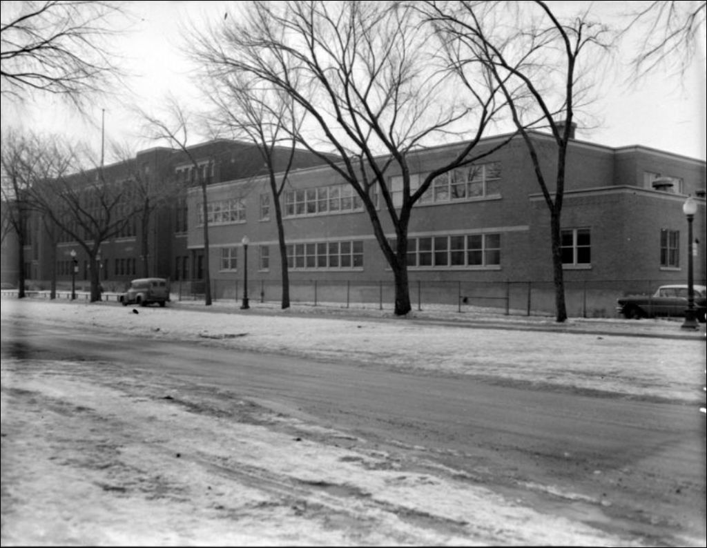 Extérieur d'une école publique, [195-?], Archives nationales à Montréal, Fonds Ministère de la Culture et des Communications, (06M,E6,S7,SS1,D213149-213149), Photographe non identifié.