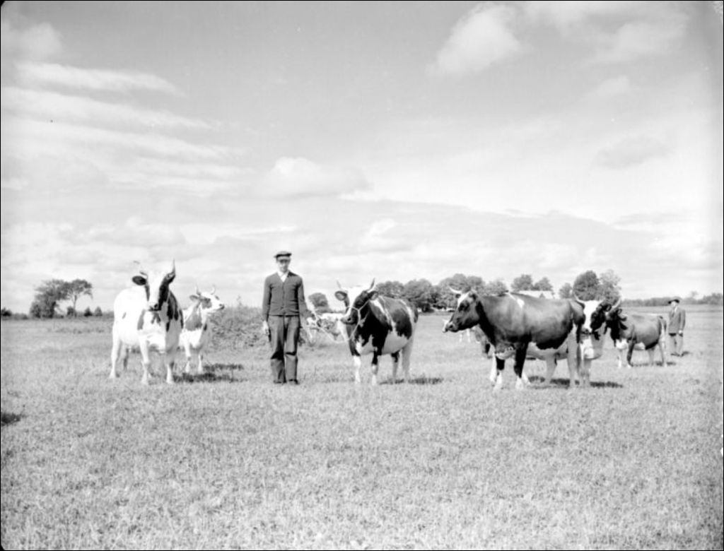 Taureaux sur une ferme à Stanbridge, en Montérégie, [195-?], Archives nationales à Montréal, Fonds Ministère de la Culture et des Communications, (06M,E6,S7,SS1,D213165-213165), Photographe non identifié.