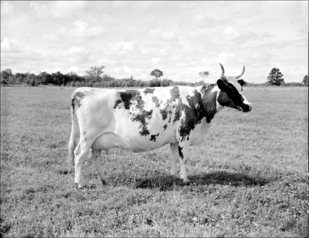 Taureau sur une ferme à Stanbridge, en Montérégie, [195-?], Archives nationales à Montréal, Fonds Ministère de la Culture et des Communications, (06M,E6,S7,SS1,D213168-213168), Photographe non identifié.
