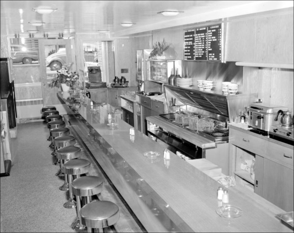 Représentation d'un restaurant où nous observons le comptoir et les tabourets, la cuisine, la caisse et le menu du jour. Photographie commandée par monsieur E. Prévost