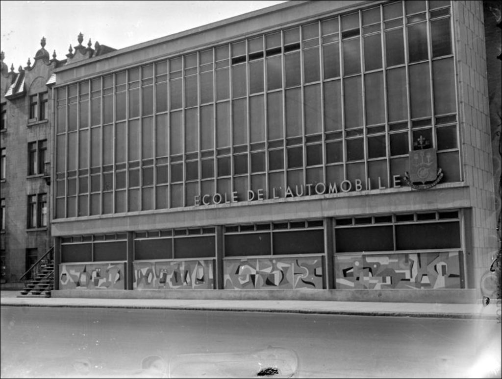 Façade de l'École de l'automobile, [195-?], Archives nationales à Montréal, Fonds Ministère de la Culture et des Communications, (06M,E6,S7,SS1,D213543-213543), Photographe non identifié.