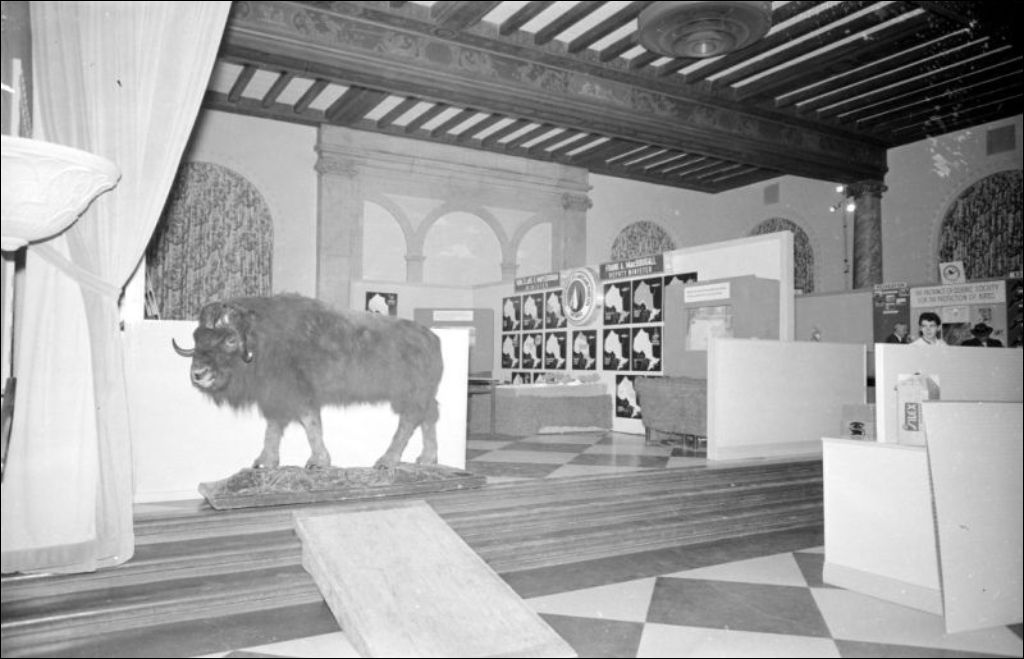 Nous remarquons un muskox empaillé (P216144) ainsi que le stand du Maine Dep. Inland Fish and Game (P216145). Un avion CF-BDY de Wheeler Airlines (P216147), une conférence (P216151, P216151), un poisson (P216149) et un kiosque portant sur les cerfs (P216146) sont aussi photograpiés. Dossier réalisé pour M. Gustave Bédard