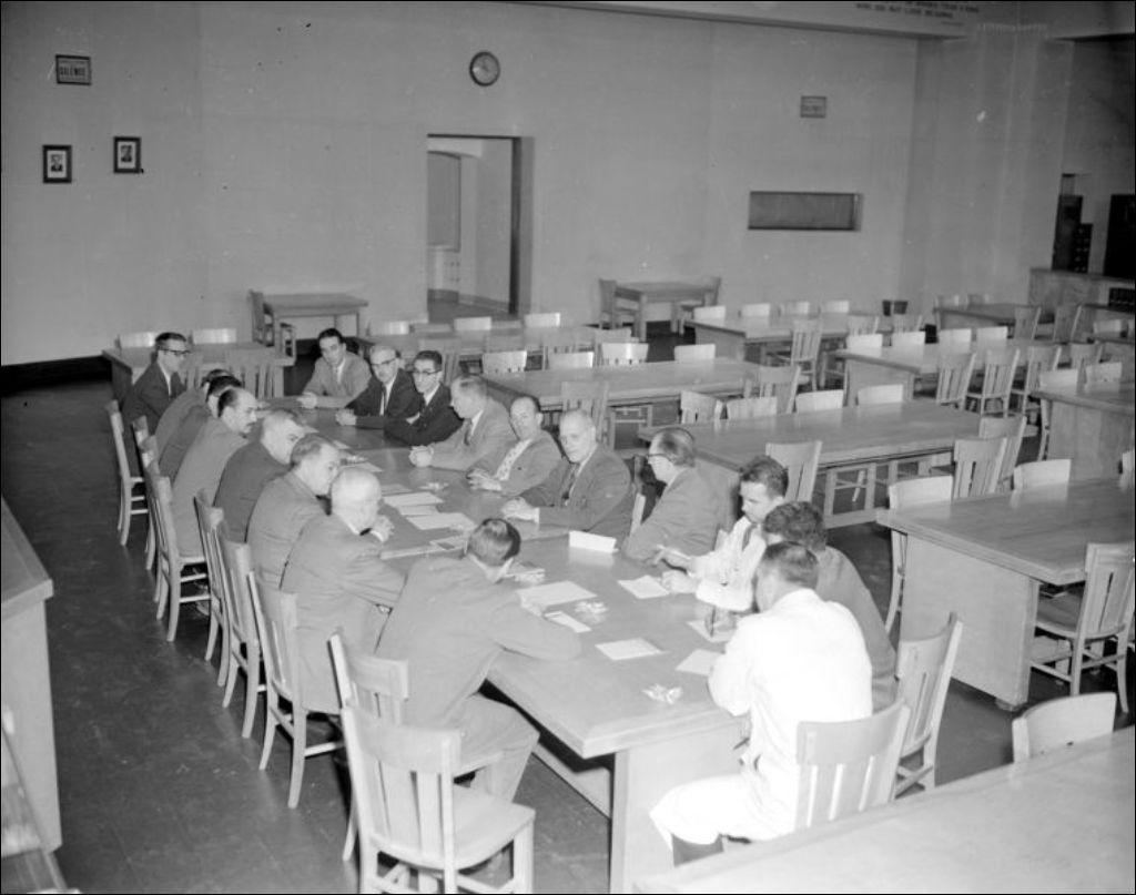 Ministère du Bien-être social et de la Jeunesse. Visite de médecins à l'École technique de Montréal, située au 200 rue Sherbrooke Ouest, [1957?], Archives nationales à Montréal, Fonds Ministère de la Culture et des Communications, (06M,E6,S7,SS1,D217354-217355), Paul Girard.