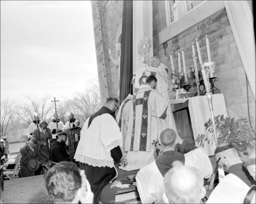 - Une foule est rassemblée près de la chapelle de la Réparation pour assister à la bénédiction. La cérémonie, célébrée à quelques pas d'un stationnement bondé d'automobiles, est présidée par Mgr Valérien Bélanger, évêque-auxiliaire de Montréal. Photographies réalisées pour M. Dallaire