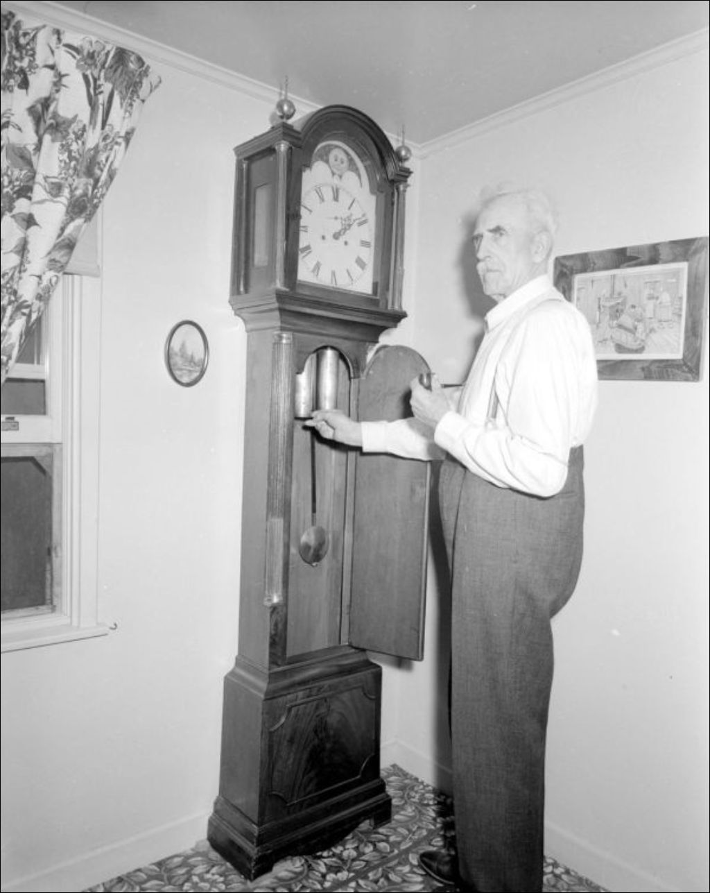 - Parmi les maisons photographiées, on aperçoit le bureau d'enregistrement de la circonscription électorale de Verchères (P217667). À l'intérieur d'une résidence, un homme ajuste la pendule d'une horloge de parquet (P217652)