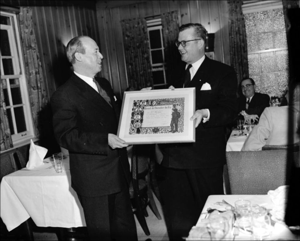 - Jean Rinfret reçoit le brevet de Chevalier du Cep et Albert Desjardins obtient le titre de Membre d'honneur de la Société des chefs de cuisine et pâtissiers de la province de Québec. Reportage commandé par M. Puvilland, directeur