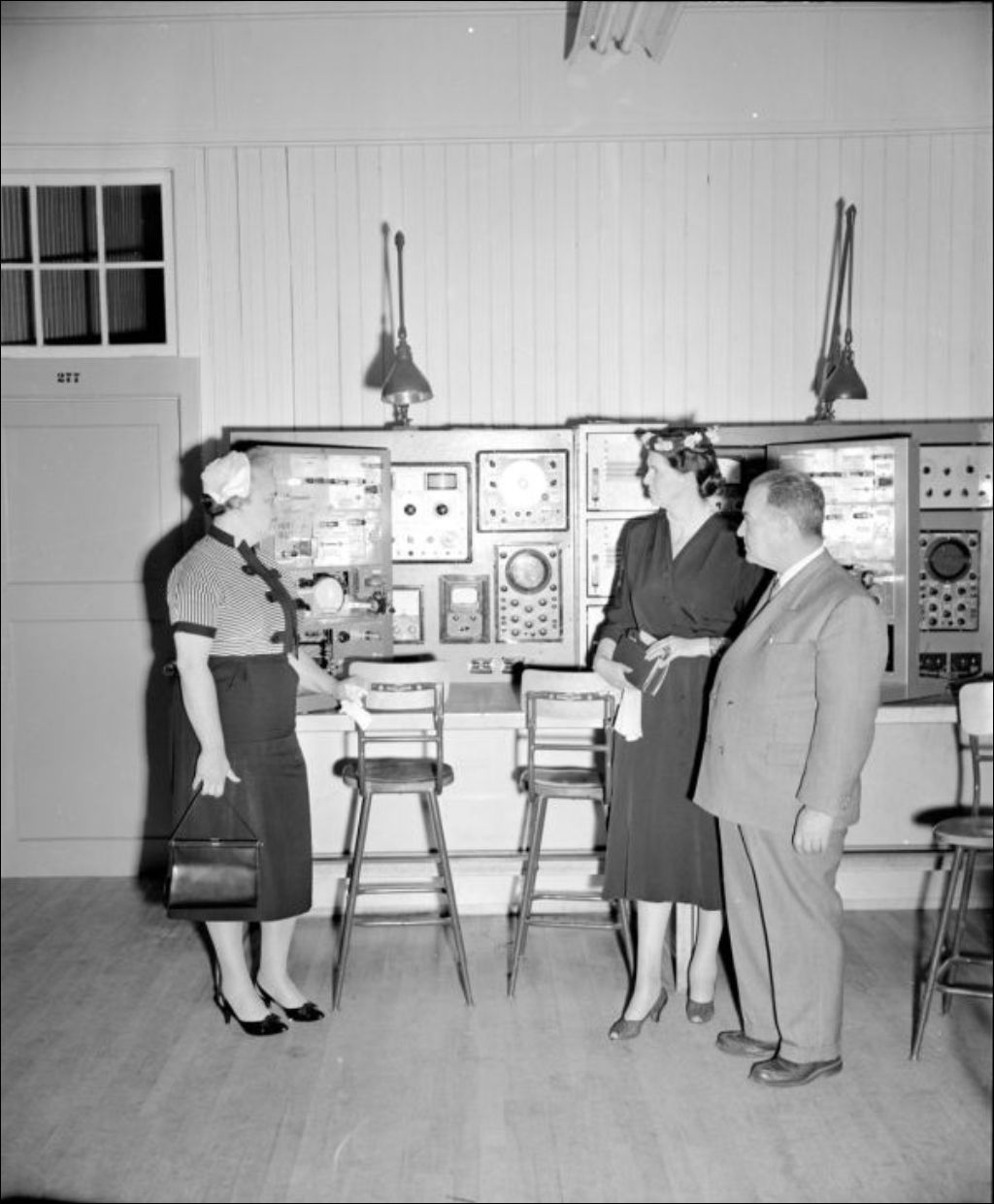 Mollie E. Cottingham, éducatrice, visite la section de l'électronique de l'Institut de Technologie de Montréal, en compagnie de Mme Gisèle Landreville et de M. W. W. Werry, assistant-directeur de l'Institut (P217791). Un cliché de l'éducatrice se familiarisant avec la technique de montage des plaques offset à l'Institut des arts graphiques compose également le dossier. L'éducatrice est accompagnée par Gisèle Landreville, Yvanhoe Leclerc, professeur, et Raymond Guyot, directeur des études à l'Institut (P217792). Reportage produit pour M. R. Prévost
